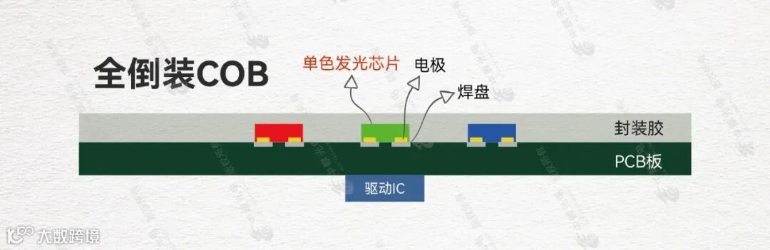全倒装COB,即RGB三颗芯片均采用倒装芯片封装在PCB上。