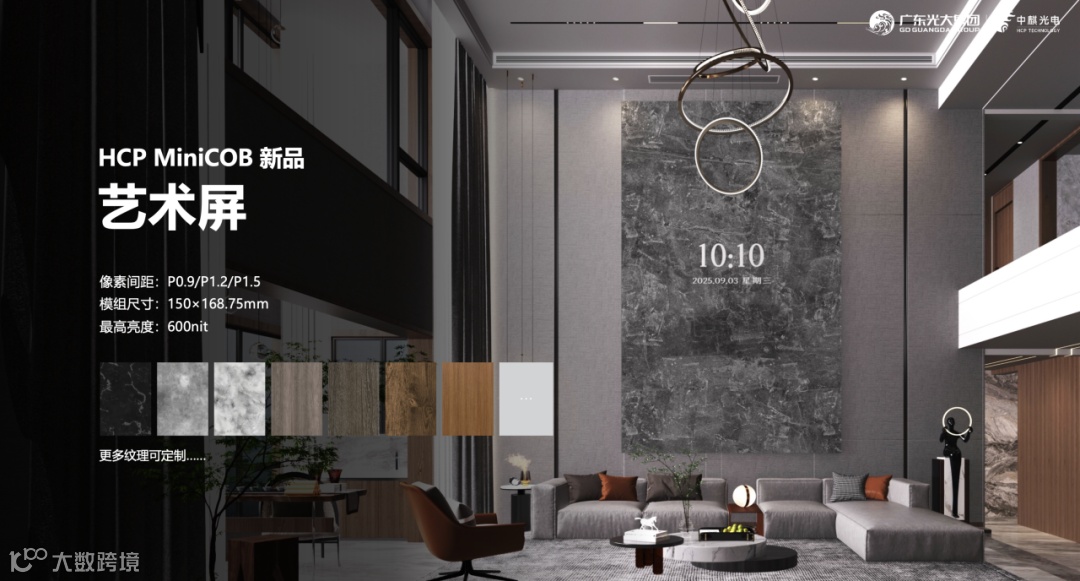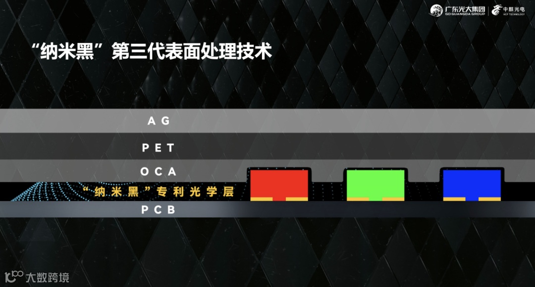 “纳米黑”技术,高亮低功耗,比常规COB节能30%以上。应用在P1.2实像素模组情况下,1000nit白屏状态下功耗仅280W/㎡、600nit白屏状态下功耗仅210W/㎡;10Lux环境光下对比度可达10000:1,实现多角度观看无麻点、极致纯黑。