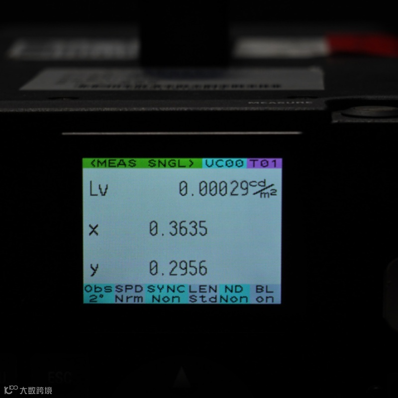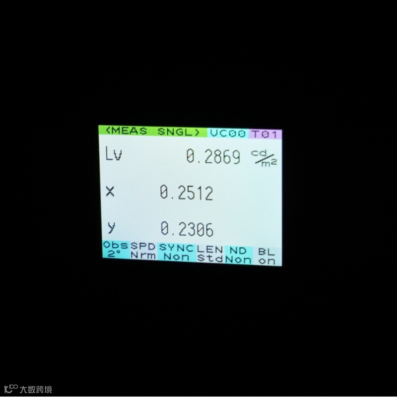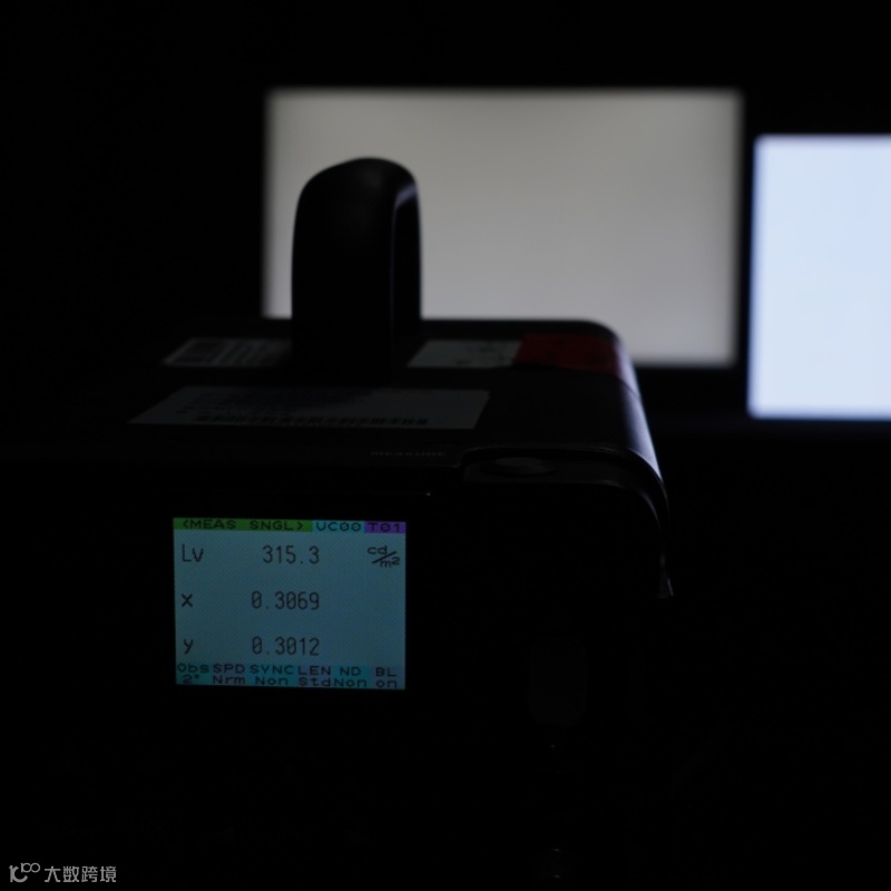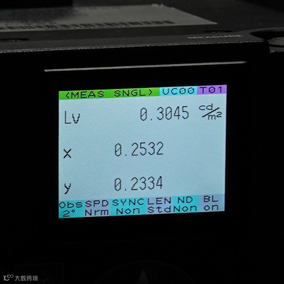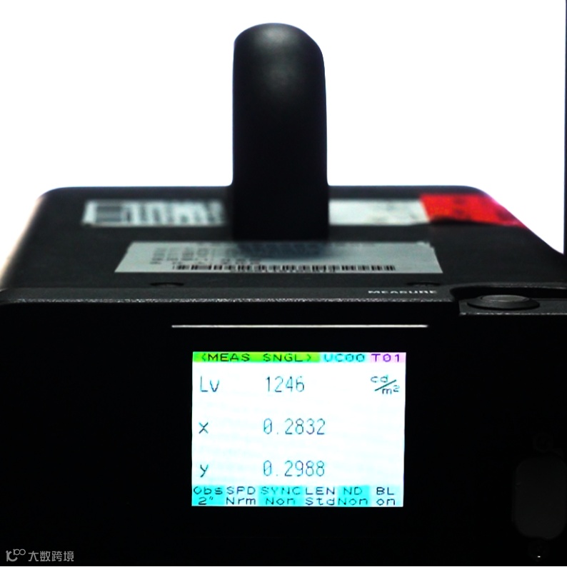 使用专业的亮度计测量不同显示屏全白(100%亮度)和全黑(0%亮度)画面的亮度值。
