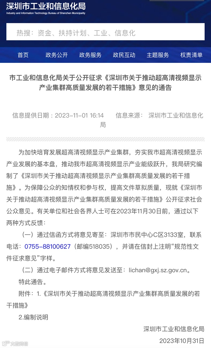 10月31日,深圳市工业和信息化局发布《深圳市关于推动超高清视频显示产业集群高质量发展的若干措施(公开征求意见稿)》,提出要推动产业能级跃升、增强自主创新能力、完善产业生态布局。