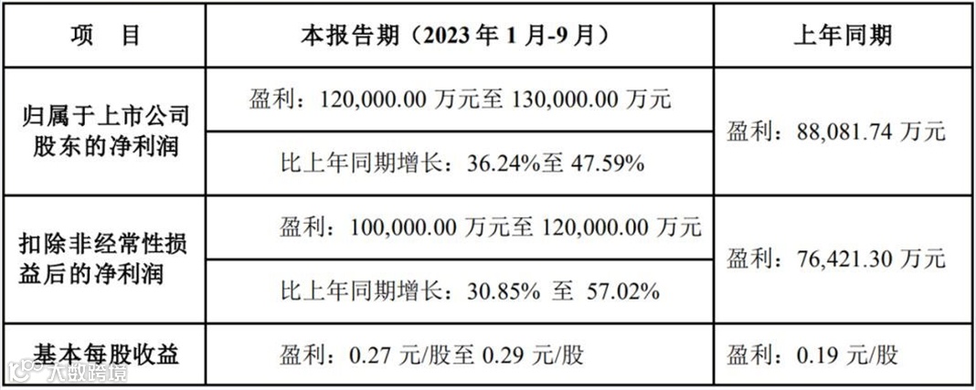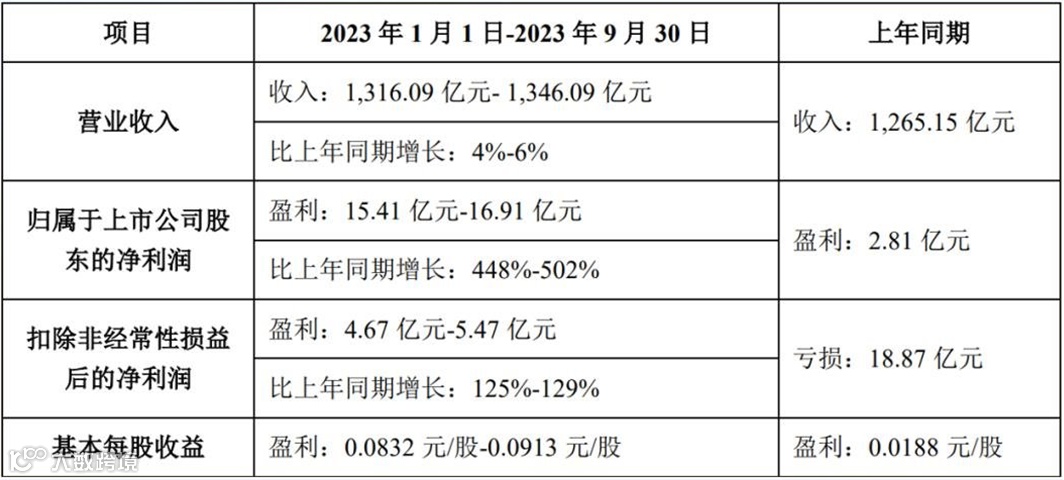 2023年前三季,TCL科技预计实现营收1316.09 亿元- 1346.09 亿元,比上年同期增长4%-6%;前三季度预计归母净利润15.41亿-16.91亿元,同比增长448%-502%。
