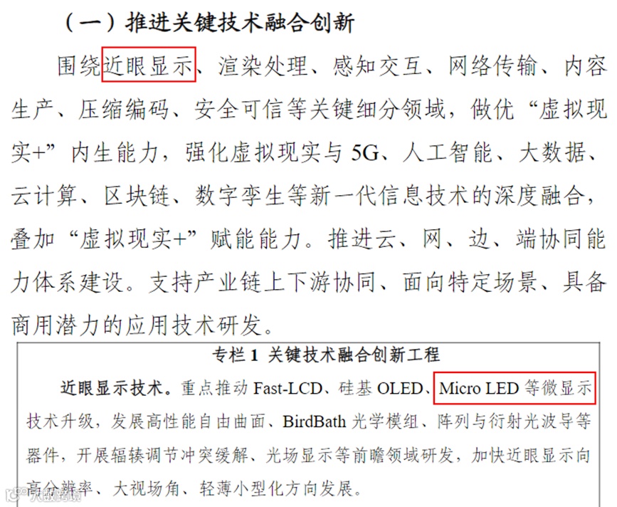 要点2:近眼显示技术领域将重点推动Fast-LCD、硅基 OLED、Micro LED 等微显示技术升级,发展高性能自由曲面、BirdBath光学模组、阵列与衍射光波导等器件,开展辐辏调节冲突缓解、光场显示等前瞻领域研发,加快近眼显示向高分辨率、大视场角、轻薄小型化方向发展;