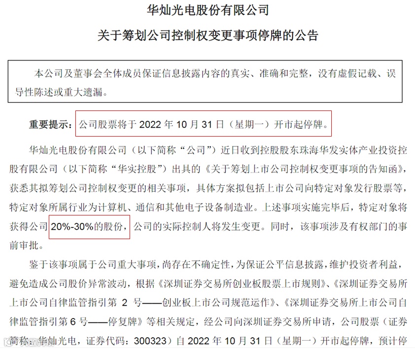 华灿光电:10月30日发布公告,表示近日收到控股股东珠海华发实体产业投资控股有限公司出具的《关于筹划上市公司控制权变更事项的告知函》;