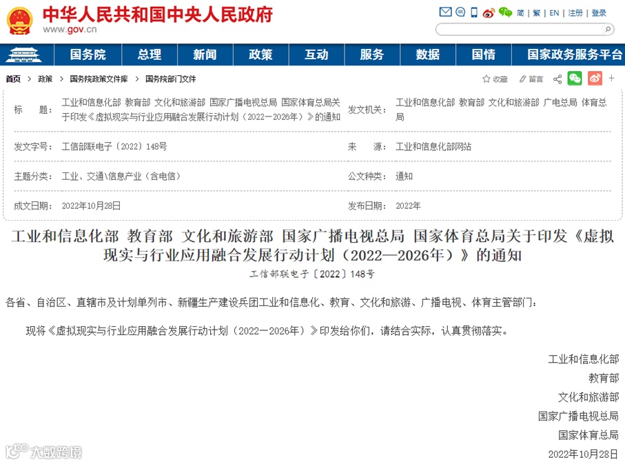 2022年10月28日,工业和信息化部、教育部、文化和旅游部、国家广播电视总局、国家体育总局联合印发《虚拟现实与行业应用融合发展行动计划(2022—2026年)》,要点如下: