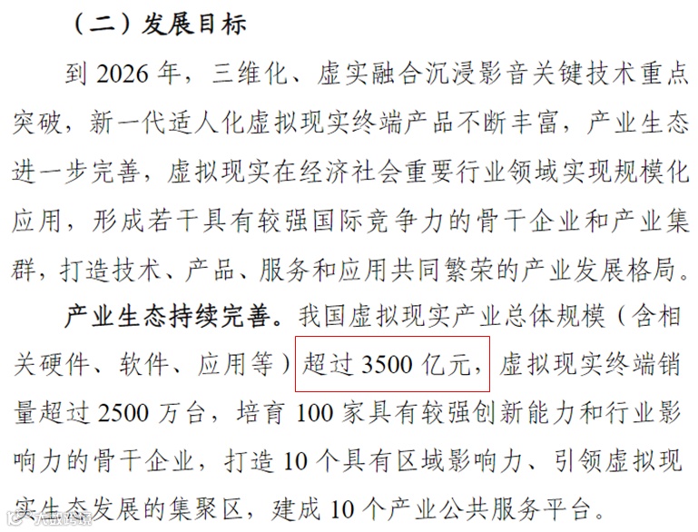要点1:计划目标到2026年,虚拟现实产业总体规模超过3500亿元,虚拟现实终端销量超过2500万台,培育100家具有较强创新能力和行业影响力的骨干企业,打造10个具有区域影响力、引领虚拟现实生态发展的集聚区,建成10个产业公共服务平台;