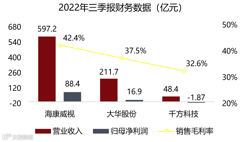 海康威视:10月29日,发布其第三季度业绩报告,实现营收为224.6亿元,同比增长3.4%;归母净利润为30.8亿元,同比降31.3%;2022年前三季度,营收为597.2亿元,同比增长7.4%;归母净利润为88.4亿元,同比降19.4%;公司目前具有完善的LED产品体系,涵盖Mini LED、小间距LED、透明屏、沉浸式体验屏、3D裸眼LED、海报屏、大尺寸LED拼接屏等商显LED产品;