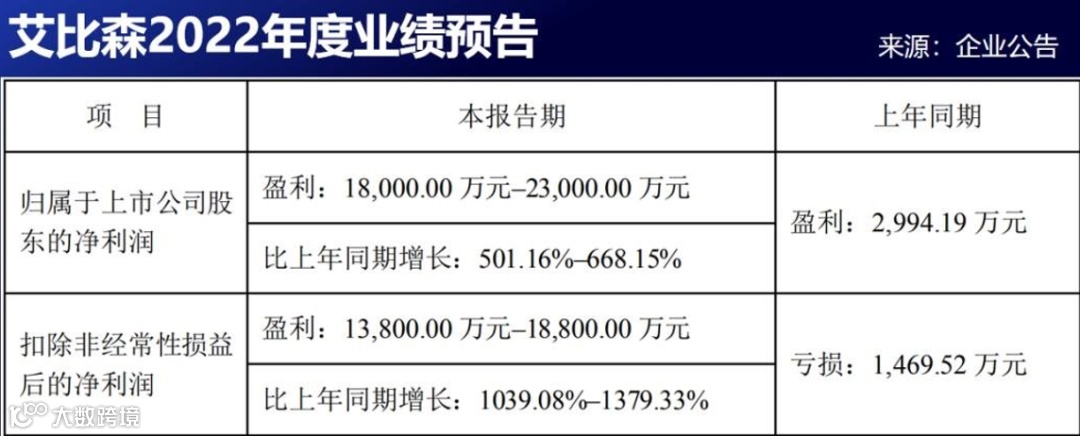 艾比森:1月5日发布公告,预计2022年度全年实现营业收入约28亿元(超过公司限制性股票激励第二个归属期营业收入底线值27.6亿元),同比2021年度增长约20%,其中海外市场营收同比2021年增长接80%;预计实现归属于上市公司股东的净利润1.8亿元–2.3亿元,比上年同期增长501.2%–668.2%;2022年公司共计实现签单约35.1亿元,同比2021年增长约17%;报告期内公司合计推出45款新产品,有力支持业绩成长及毛利率的提升。