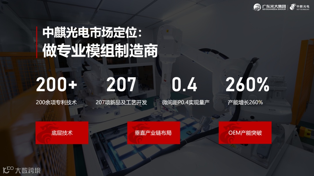 中麒光电在发展初期就以全产业链的先行者姿态进入COB市场。而面对当前的产业变革,中麒充分发挥十余年的技术积淀优势,已经形成以芯片制程与模组制造为中心的全产业链布局,进一步强化产品竞争及OEM/ODM制造实力的优势,形成产业链协同效应。