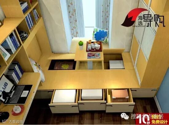 这款榻榻米最大的特点就是大容量!满足一切物品收纳的需求。升降桌升起时可以用作办公、娱乐,放下可以用作睡眠。连书桌、书架、衣柜都是可以定制的哦!一次性解决整个房间的需求。