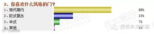 选购木门的风格方面,69%的消费者选择“现代简约”,23%的消费者选择“欧式复古”风格,还有7%的消费者选择“中式”。