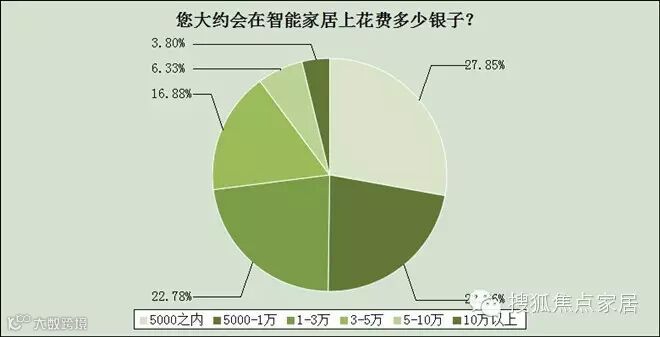 数据显示,选择智能家居产品,消费者最在乎的选项依次是:价格、质量、功能、外观。其中价格因素占到17.25%。高售价是智能家居产品接受度的一道门槛。对于普通消费者来说,5千——3万的预算是可以接受的价格。5千之内占27.85%,略高。而5千-1万和1万-3万,相差不大,都在22-23%。可见,智能家居产品要成为大众消费,首先要实现价格亲民。