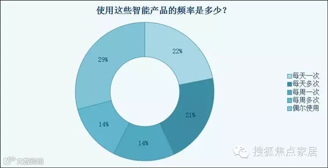 智能产品买回家之后,消费者到底有没有真正使用呢?调查数据并不乐观,近三成消费者选择了偶尔使用,各有22%的消费者选择了每天一次和每天多次。而每周一次和每周多次均在百分之十几。虽然智能产品品类丰富,使用频次各不相同,但是整体来说是频次不高。