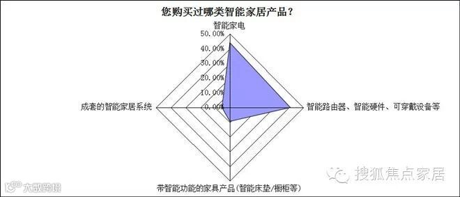 在智能家居品牌的认知度中,消费者对家电品牌和互联网公司的认知度普遍高于智能控制类的品牌。与此对应的,在消费者购买的智能产品中,智能家电以44.08%的占比拔得头筹,而智能路由器、智能硬件等可与之关联互通的产品紧随其后,占到41.12%。带有智能功能的家具产品和成套的智能家居系统产品反倒没有超过10%。