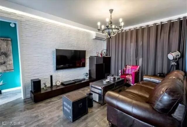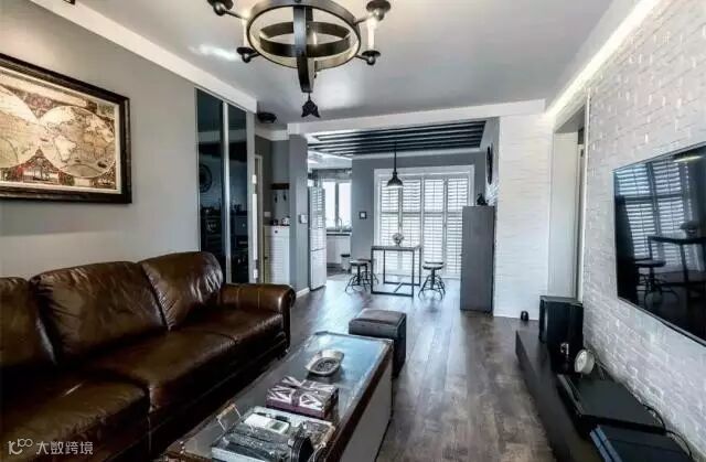 深棕色的布艺沙发,结合沙发墙上一幅复古调的地图,搭配现代文艺的电视墙,形成一种鲜明的对比气息;