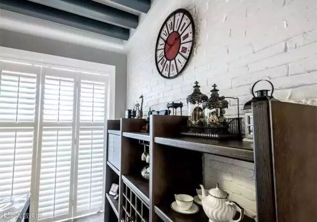 餐厅背景墙的文化砖上挂一个复古调的挂钟,再摆上一套复古餐边柜,结合精致的摆饰,整个空间都透着一股舒适惬意的气息;