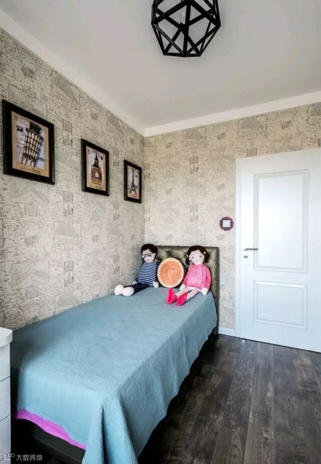 次卧的墙面也贴着丰富图案的壁纸,摆上一张小小的床,小空间也显得奢华端庄;