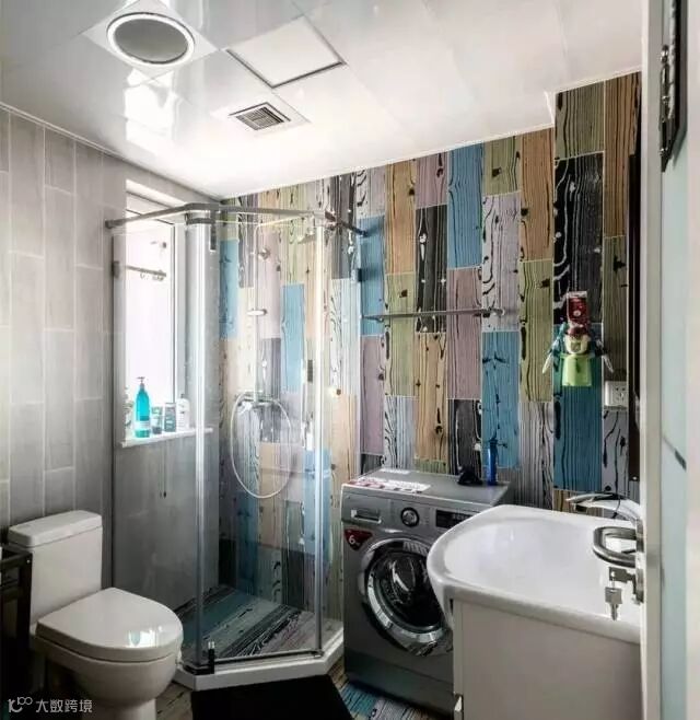 卫生间墙面以彩色木纹砖铺贴,显得充满了艺术感;在紧凑的空间,还把洗衣机摆进里面,非常实用;
