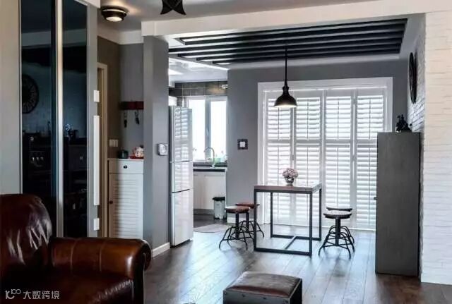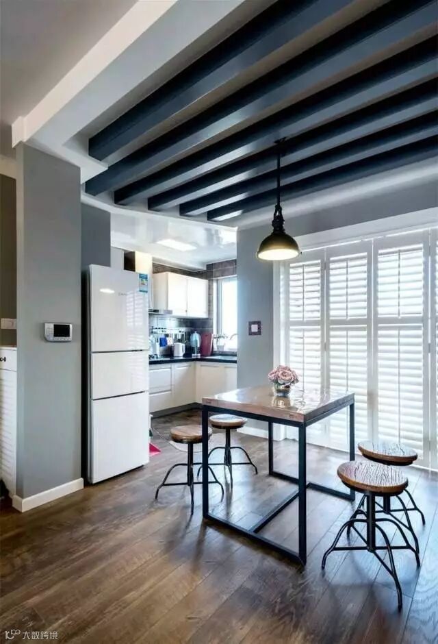 黑色假梁装饰,结合开放式厨房的格局,为这个空间营造出了个舒适惬意的空间氛围;