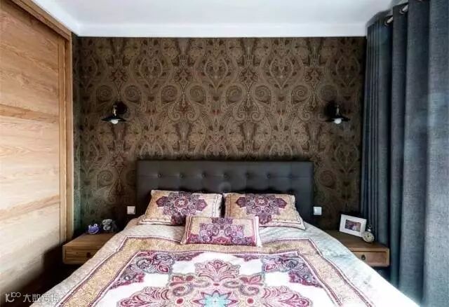 主卧的床头贴纸复古深色图案的壁纸,搭配上深色的皮艺床头、复古图案的床单与素蓝窗帘,整个卧室都显得稳重优雅又独特奢华;