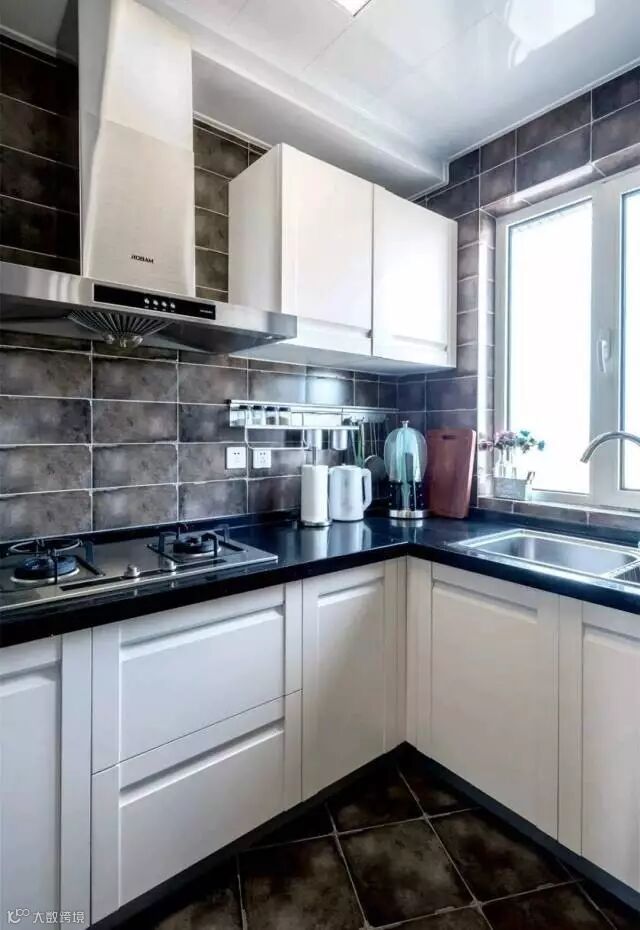 厨房墙面与地面砖都是与铜锈质感的铺贴,打造白色的橱柜与黑色的台面,在墙面上装上实用的挂杆钩,平时厨具可以方便地挂在上面,非常实用;