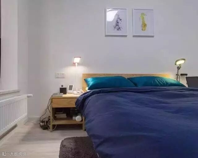 没有飘窗的卧室,用床头柜来摆放各种杂物,卧室的空间都比较充足,两间卧室主要的区别就在于木地板和床品的选择。