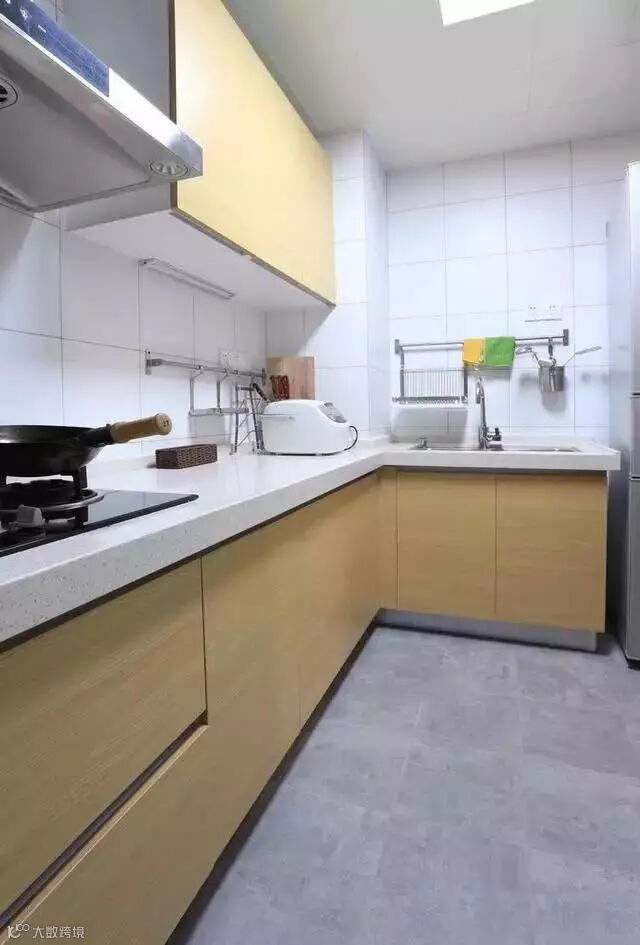 L型的橱柜是最适合小户型狭长厨房空间的,有着充足的操作台,也可以多出更多的墙面可利用空间,满足各种厨房厨具的收纳。