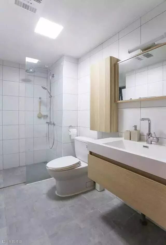 卫生间干湿分离,镜柜加马桶上方的柜子设计,可以满足卫生间的收纳需求,白色的墙砖和浅灰色的地砖搭配起来,非常明亮。
