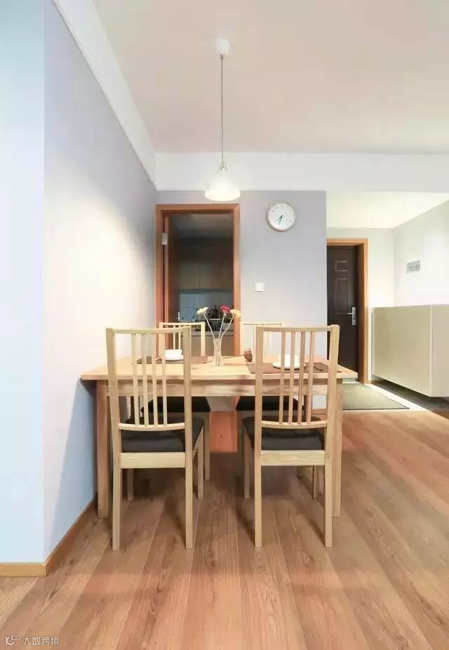 小餐厅这里没有任何的装饰品,非常朴素,就靠原木色的餐桌椅来点缀餐厅空间,餐厅的边上就是厨房,所以餐边柜装到了另一边墙。