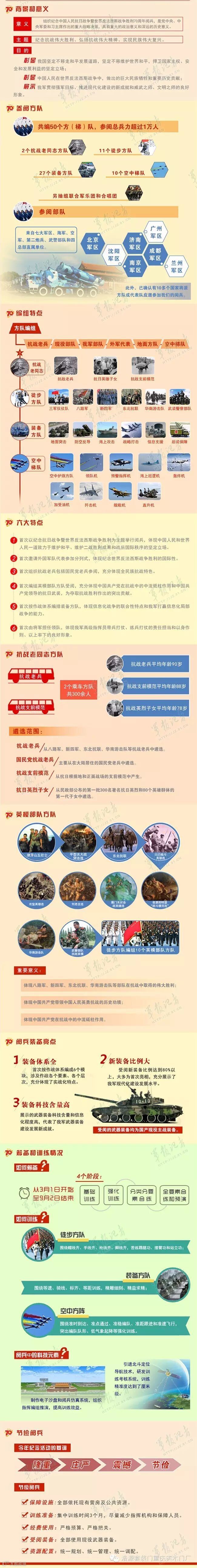 导读:纪念中国人民抗日战争暨世界反法西斯战争胜利70周年阅兵式(简称9·3阅兵,或者抗战胜利日大阅兵),是中国政府为纪念中国人民抗日战争暨世界反法西斯战争胜利70周年而开展的众多纪念活动中的一项活动。阅兵于