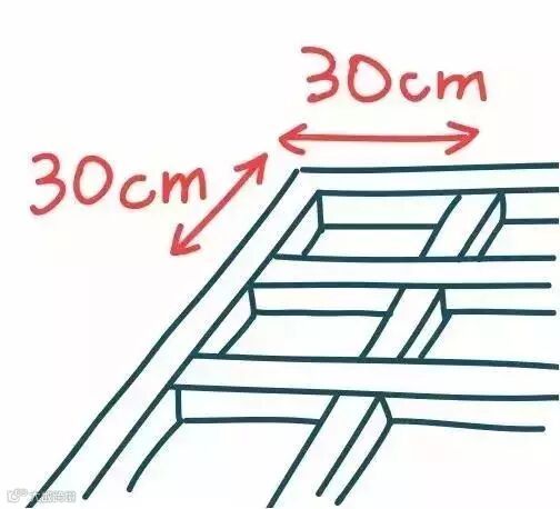 间距:木龙骨间距不小于30×30cm,保证每条地板至少要架在两条龙骨上。