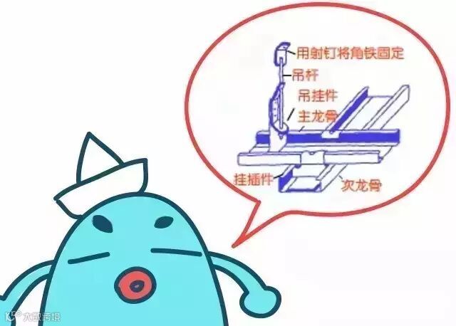 吊顶:吊顶龙骨必须用配套胀栓吊件固定,用专用龙骨接头对接