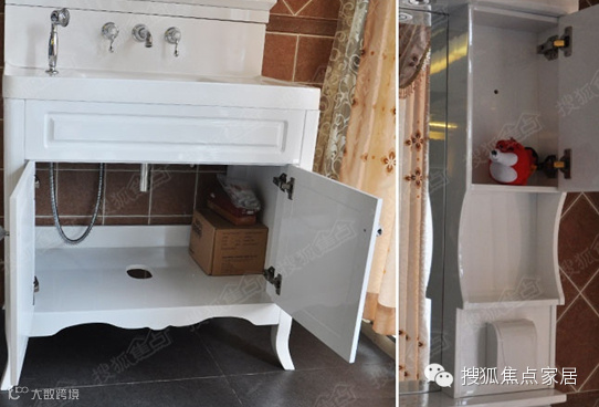 柜体中间可以存放梳洗用品,同时起到隐藏的作用,把水管等藏匿在柜体中。在镜子旁边也设计了一个带有柜门的收纳格以及不带柜门的收纳区域。储物功能非常丰富,使用方便。