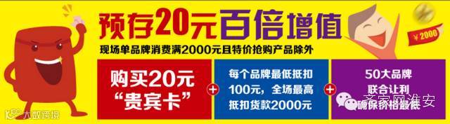 预存20元“贵宾卡”每个品牌最低可抵扣100元,最高可抵货款2000元,50大品牌联合让利,确保价格最低(单品牌消费满2000元以上且特价抢购产品除外)