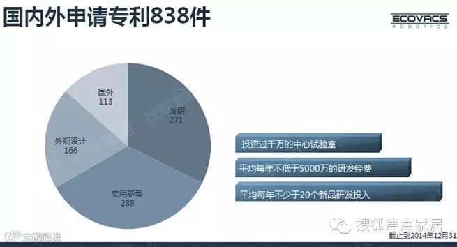 我们申请的专利有838件,每年大概20%的费用投入到研发。科沃斯参与了一些国际标准的制定.有一些产品获得国内的奖项,今年我们获得了红点奖。