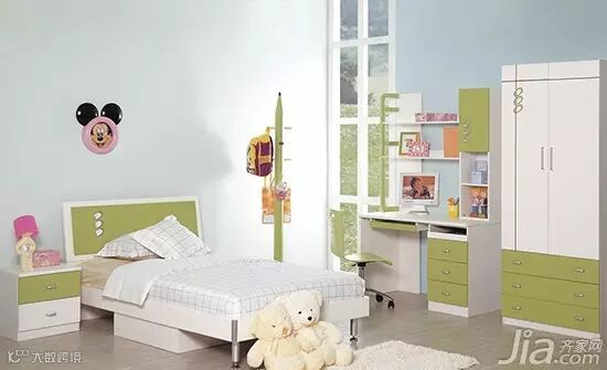 体积较大的家具不宜用太过鲜艳的颜色,而应保持柔和的色调,如粉色、浅蓝色、浅黄色等,以减少过强的刺激。这样有利于心情的放松和平静,有利于睡眠以及形成固定的习惯,还有利于稳定个性的养成。