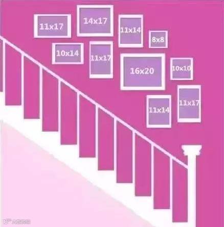 此款包含十个相框,分别为一个16*20、一个14*17、三个11*17、两个11*14、一个10*14、一个10*10,一个8*8,按照楼梯倾斜方向排列。