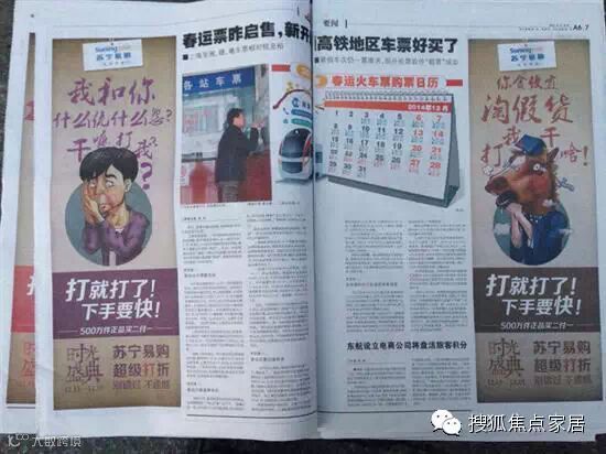 阿里之外,一些知名大型家居电商也自然不会放过“双十二”这个可以捞金的商机。苏宁还是一如既往地推出“提前购”,“100元都不肯给我!还打我”“我的项链2000块!不要打我!”“我和你什么仇什么怨?干嘛打我?”“你贪便宜淘假货,打我干啥!”系列“打脸”宣传广告再度成为业界热议的话题,而其中一张马头外加几朵云的卡通图画更是被指暗讽马云和淘宝,令无数看官直呼“醉了”。