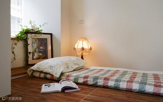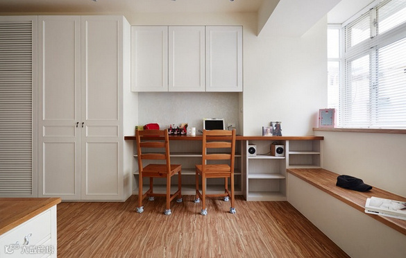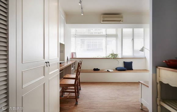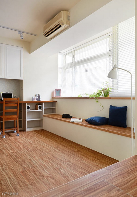 设计师针对女屋主的需求,让住办的机能合而为一:由温润柚木所构组的书桌,成为工作场所。窗台下、架高45公分的卧榻区是客厅的座椅,让空间的利用更为简练与弹性。来到睡眠曲,同样架高的地坪,划分成九宫格的收纳功能,让生活用品可以一一归纳,在收纳上更整齐不杂乱。