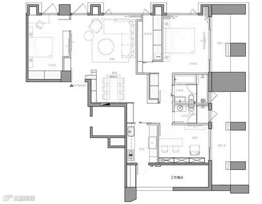 空间格局:玄关、客厅、餐厅、厨房、书房、主卧房、次卧室、卫浴×2、工作阳台
