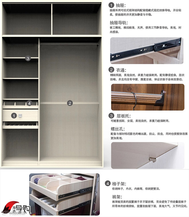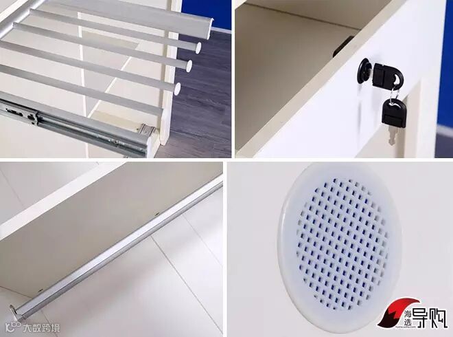 衣柜的最大特点就是,格局较为细致,如格子架对零散物品的收纳能力很强。裤架和格子架均带有滑轨设计,使用非常便捷。不足之处在于,悬挂区域上下分割不明细,收拾不当容易造成衣物混乱。
