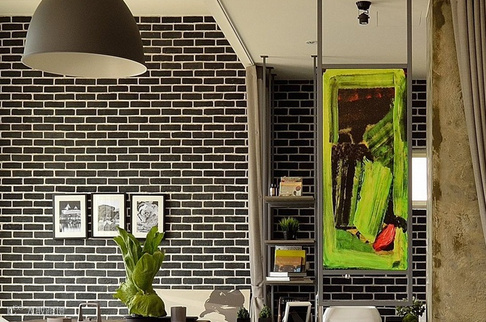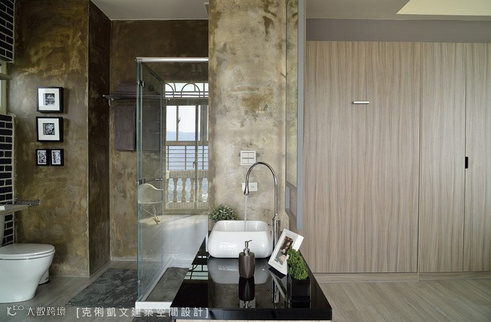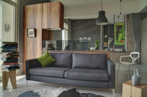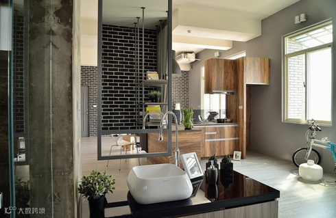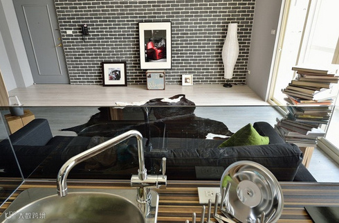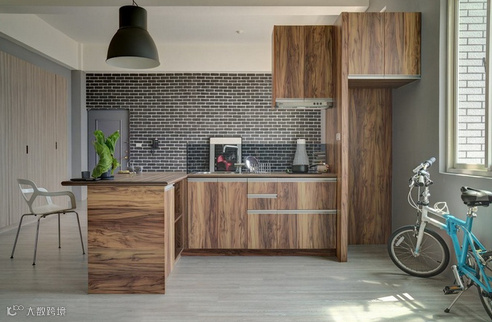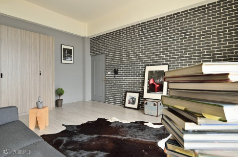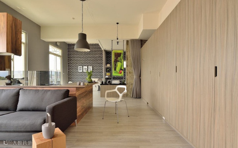 材质与色彩运用上,棘手的长形空间里,黑白对比的文化石墙是两端点地时尚主景,透过深、浅木色链结,串接而起收纳与烹调机能,最末,在弹性透视的卫浴空间中收尾,视角流动而出的轻盈,让看似单一的空间,有了大尺度的无限想像。