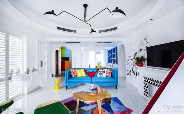 纯白的空间因为艳丽色彩的丰富而多姿多彩起来,设计师不仅在沙发区应用活泼的色彩描述,地毯机墙壁也不漏下。