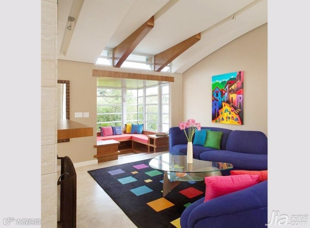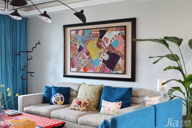 蓝紫色的沙发在浅色的背景墙衬托下愈发显眼,多彩的抱枕、地毯及装饰画的点缀,让客厅更多了几分鲜艳和活力。
