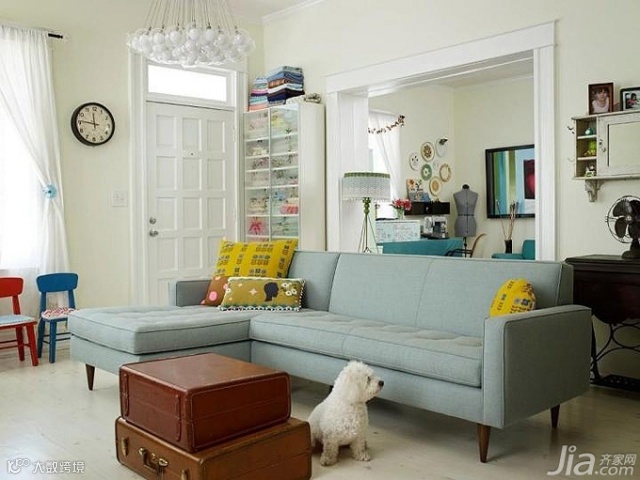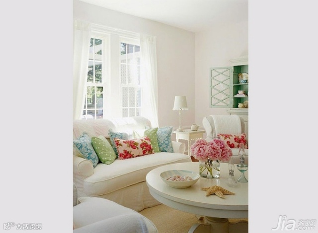 靠枕的主色调以沙发的两种色彩为主,蓝色的靠枕伫立在米灰色沙发上很是显眼。此外还点缀了几只碎花小抱枕,明亮的色彩让客厅富有生气。
