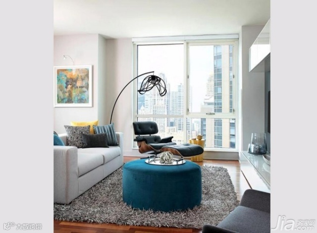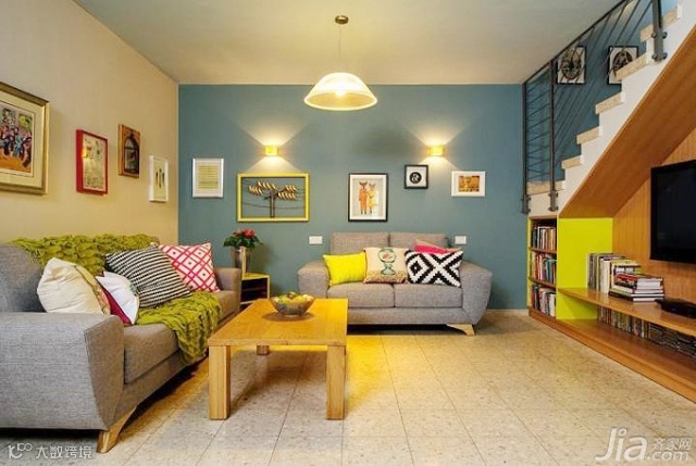 中性色调的软装让小小的客厅显出几分温馨柔和,明黄、蓝、黑三种色彩的点缀清新活泼却不失时尚稳重。