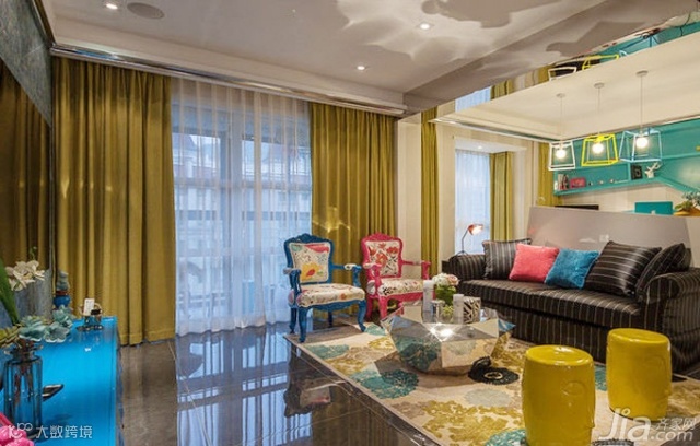 沙发的色彩是暖暖的深秋色,抱枕则以同样暖暖的蓝色、红色为主,既显出几分活泼也不失秋的格调,地摊上的两只蘑菇状凳子很有个性。