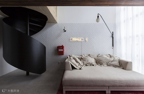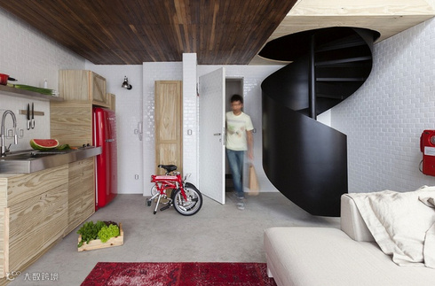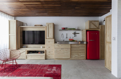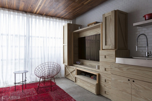 设计师利用有限的空间,把单一的墙壁转换成存储厨房和客厅。红色的运用,张扬且热烈。木质的电视收纳柜,简约实用。主人卧室也选用了黑色调,实在个性十足!
