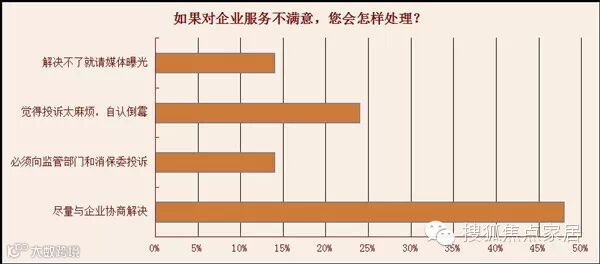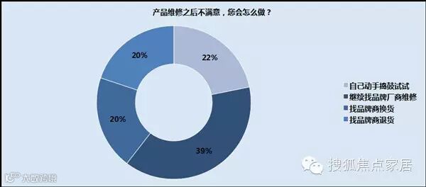 一旦未能获得与期望相符的售后服务时,消费者的态度很鲜明,拒绝二次被宰,不做回头生意。“不满意,基本不会做回头客”这一选项再次呈现压倒式的结果。不过即便获得满意的服务,仍然有17%的消费者表示会考虑尝试其他品牌。消费者有选择的自由,而企业要做的就是做好一切准备让消费者来选择。消费者也怕反复维修,就会尽量选择品牌有保证、制作精良的家居、家电产品。