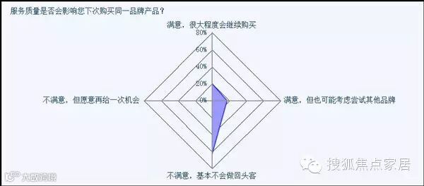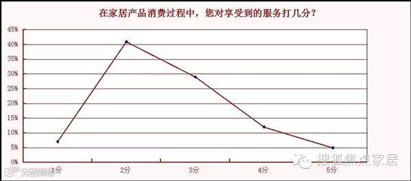 从这组数据来看,呈现两头大中间小的趋势,消费者对于家居产品消费过程中享受到的满意服务还很少。售后服务体系的整体滞后,安装、售后、维修等服务环节难以跟上,令消费者倍感无奈。当然这跟家居产品的属性有关,其服务环节比较复杂,从设计生产、到物流配送、安装验收、环境搭配,各个环节都对售后服务提出了要求。
