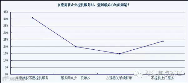 大多数家居产品过了保修期后才出现问题。而一旦脱离保修期,产品就像没人管的野孩子。数据显示,41%的商家推脱不愿提供服务,24%则不提供上门服务。这必然又给消费者带来送修的困扰以及过程中的扯皮。因此,家居行业需要对现有的服务理念和体系进行全面升级。